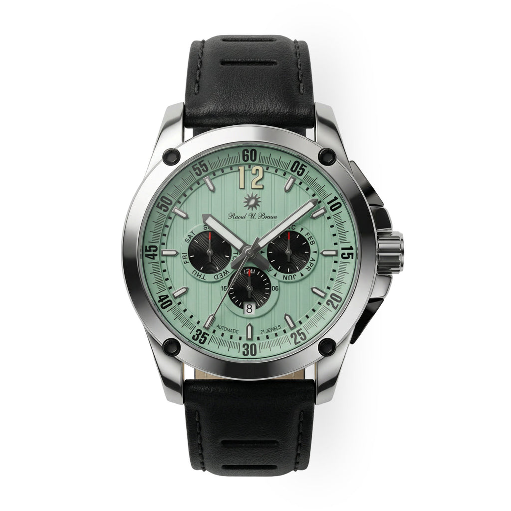 Die Raoul U. Braun Automatikuhr RUB05-0431-SL-mint-s richtet sich an Herren, die sportliche Technik mit modernem Design verbinden möchten. Das 47-mm-Edelstahlgehäuse wird durch schwarze Nieten auf der Lünette sowie seitlich gefräste IPBlack-Akzente dynamisch inszeniert und sorgt für einen kraftvollen Auftritt am Handgelenk.