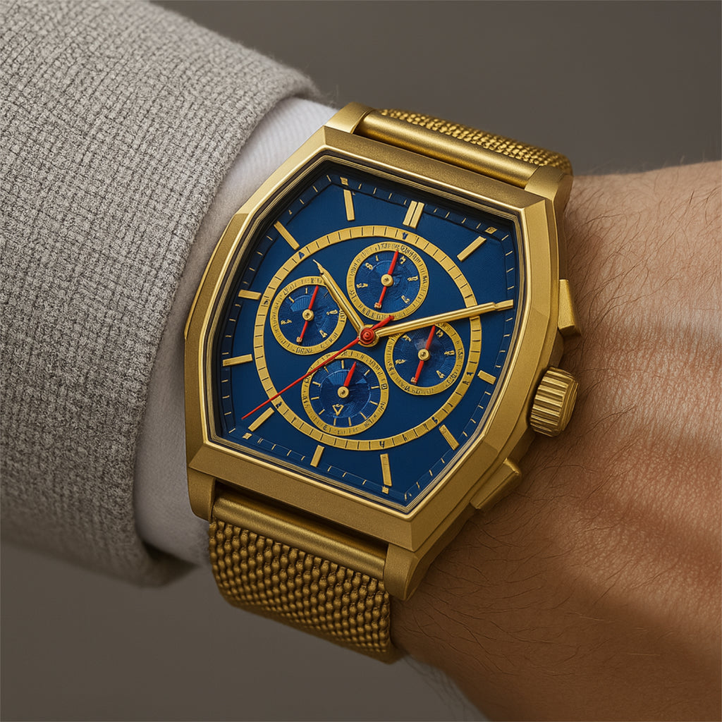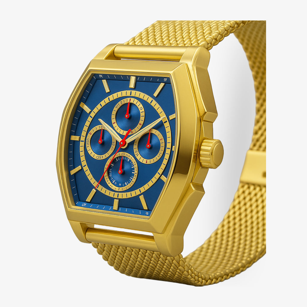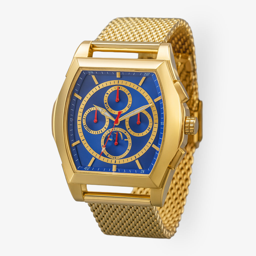 Die Raoul U. Braun RUB05-0482GM-bl-go vereint klassisches Uhrendesign mit präziser Automatiktechnik. Ihr tonneau-förmiges Edelstahlgehäuse in edler IPG-Goldplattierung verleiht ihr eine luxuriöse Note, während das kräftig blaue Zifferblatt mit goldfarbenen Zeigern und Elementen für einen kontrastreichen und eleganten Look sorgt.