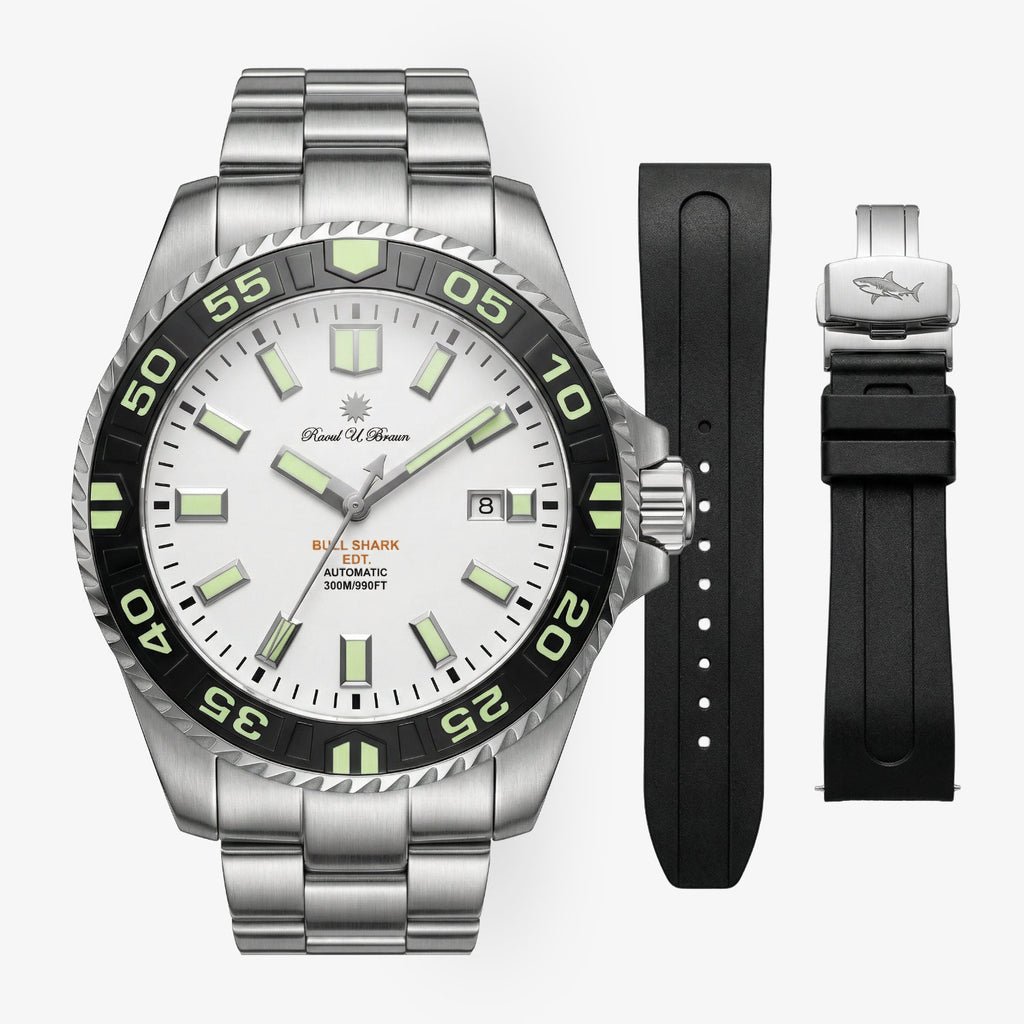 Geliefert wird die Bullshark Edition mit zwei hochwertigen Armbändern: einem massiven silberfarbenen Edelstahlband mit graviertem Bullshark sowie einem zusätzlichen Silikonband mit Shark-Gravur für sportliche Einsätze.