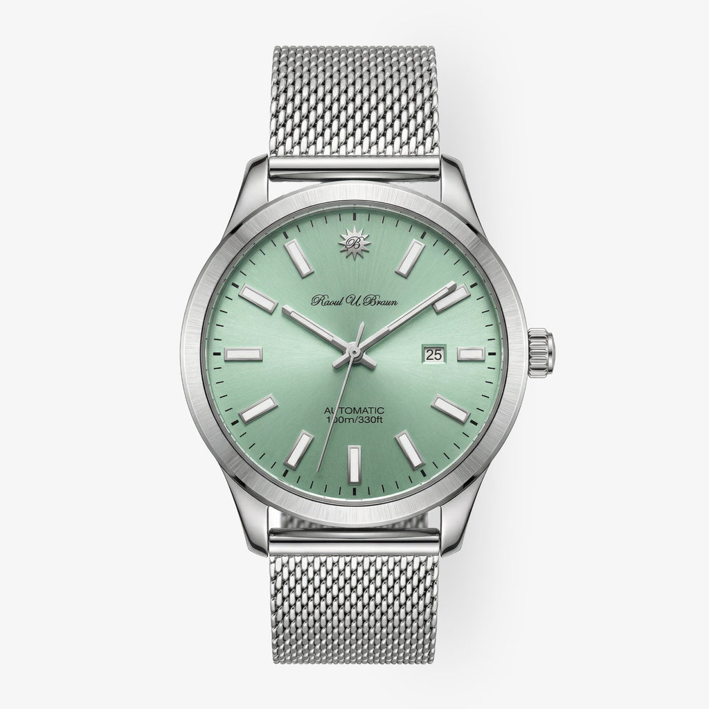 Die Raoul U. Braun Automatikuhr RUB05-8215-SM-mint «London», auf 44 Exemplare weltweit limitiert, kombiniert klassische Uhrmacherkunst mit moderner Grossstadt-Ästhetik. Das robuste 45 mm Edelstahlgehäuse sorgt für eine markante Präsenz am Handgelenk, während das mintfarbene Zifferblatt im Sonnenschliff bei Lichteinfall elegante Reflexionen erzeugt.