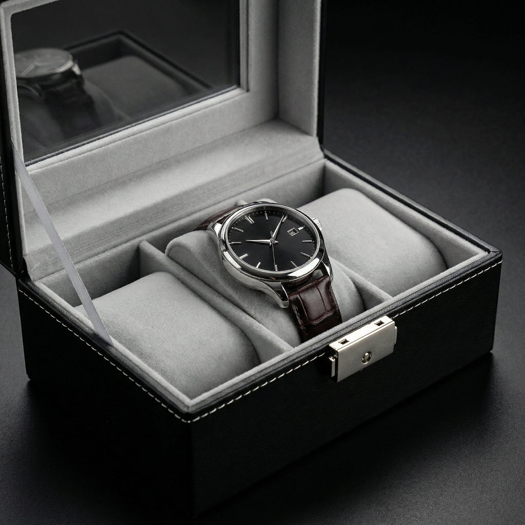 Im Inneren sorgt die graue Samtauskleidung für optimalen Schutz vor Kratzern und Beschädigungen. Drei gepolsterte Uhrenkissen halten Ihre Zeitmesser sicher in Position. Der transparente Glasdeckel schützt vor Staub und ermöglicht gleichzeitig eine dekorative Präsentation Ihrer Sammlung.