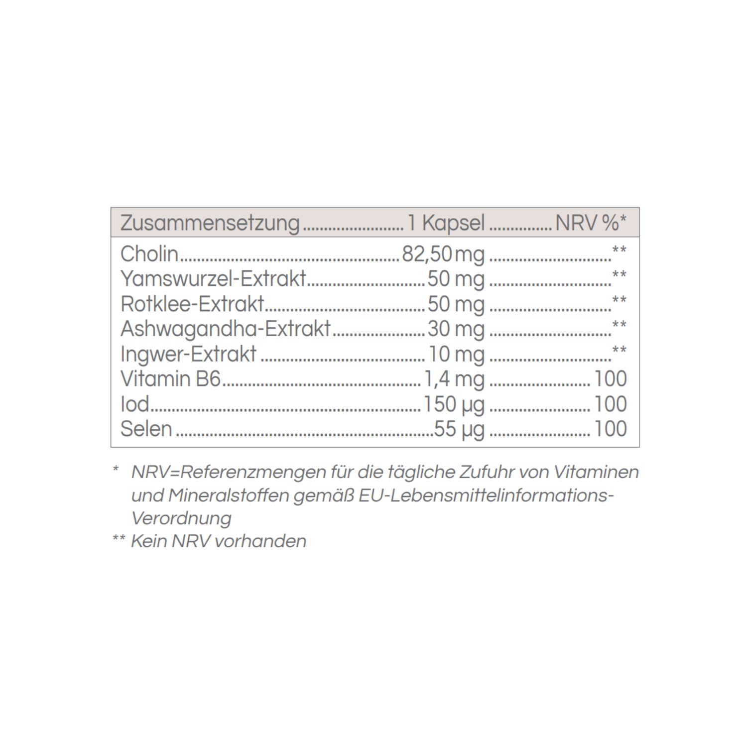 Rotklee, reich an Isoflavonen – sogenannten Phyto-Östrogenen – kann helfen den Hormonhaushalt, der sich in den Wechseljahren umstellt, zu stabilisieren. Gemeinsam mit Yamswurzel, Ashwagandha und Ingwer-Extrakt bildet er die pflanzliche Basis dieses Präparats – inspiriert von der Naturheilkunde. Ergänzt wird die Formel durch Cholin, Vitamin B6, Jod und Selen – Nährstoffe, die gezielt zur Unterstützung der Regulierung des Hormonhaushalts, zur Unterstützung des Nervensystems sowie zur Erhaltung normaler Haut, Haare und Nägel beitragen.